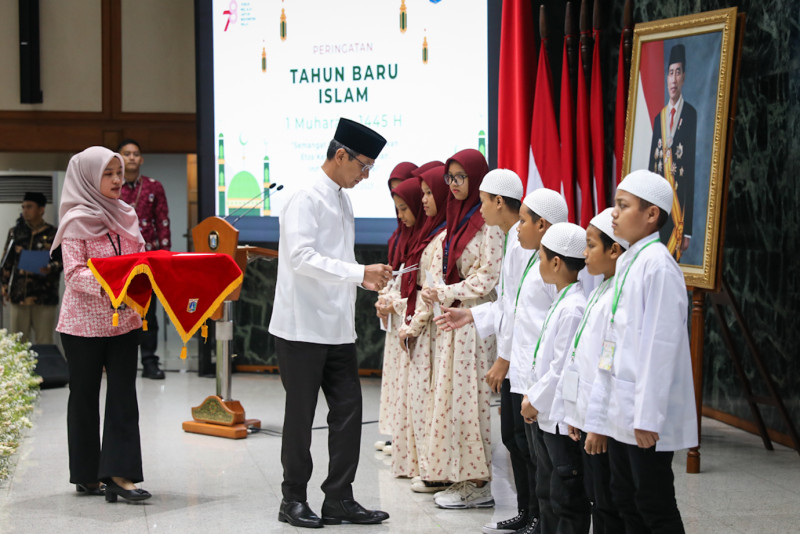 Penjabat (Pj) Gubernur DKI Jakarta, Heru Budi Hartono menghadiri peringatan Tahun Baru Islam 1 Muharam 1445 Hijriah di Balai Kota DKI Jakarta, Selasa (18/7). Dalam peringatan Tahun Baru Islam tersebut, Pemerintah Provinsi (Pemprov) DKI Jakarta memberikan santunan kepada 50 anak yatim piatu dan duafa.