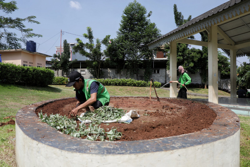 Petugas Suku Dinas (Sudin) Pertamanan dan Hutan Kota Jakarta Timur melakukan penataan di Taman Maju Bersama (TMB) Tulip, Kelapa Dua Wetan, Ciracas, Senin (17/7). Pentaan TMB tersebut dilakukan agar lebih indah dan rapih serta tidak dimanfaatkan untuk aktivitas negatif oleh pihak tak bertanggung jawab.