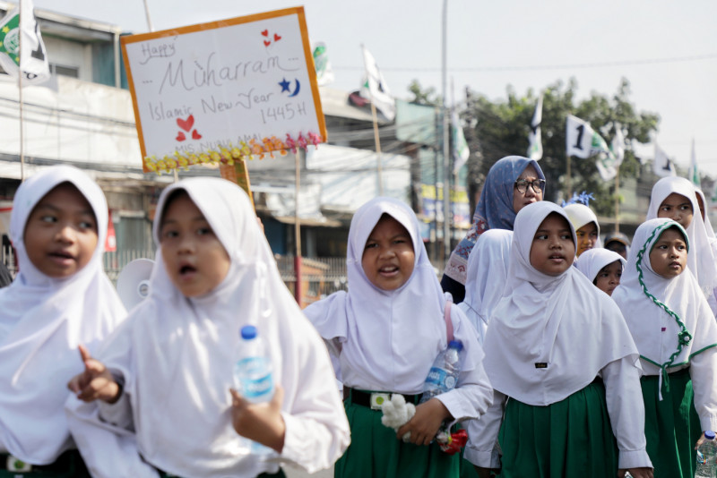 Sejumlah pelajar melakukan pawai di Jalan Raya Bogor, Kramat Jati, Jakarta Timur, Selasa (18/7). Pawai tersebut dilakukan dalam rangka menyambut Tahun Baru Islam 1 Muharam 1445 Hijriah di Jakarta.