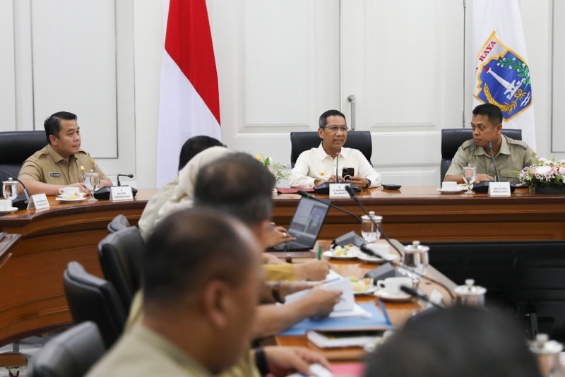 Penjabat (Pj) Gubernur DKI Jakarta, Heru Budi Hartono memimpin Rapat Pimpinan (Rapim) di Ruang Rapat Gubernur, Balai Kota DKI Jakarta, Selasa (18/7). Rapim tersebut terkait pembahasan lanjutan sinkronisasi data kemiskinan yang dihadiri oleh Sekda Joko Agus Setyono, sejumlah Asisten dan Kepala Dinas, serta seluruh Wali Kota dan Bupati di wilayah DKI Jakarta.