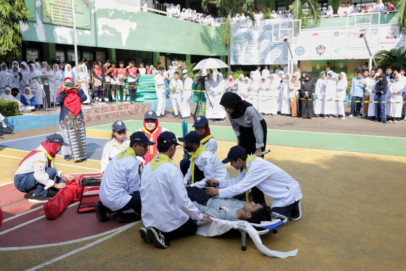 Palang Merah Indonesia (PMI) Jakarta Selatan membagikan ilmu mengenai kesiapsiagaan bencana kepada peserta didik dalam Masa Pengenalan Lingkungan Sekolah (MPLS) di SMKN 47 Jakarta, Jalan Condet Pejaten, Pejaten Barat, Pasar Minggu, Jakarta Selatan, Jumat (14/7). Dalam kegiatan ini PMI Jakarta Selatan mengerahkan 6 petugas dan satu pembina dalam melakukan sosialisasi, serta praktik simulasi mengenai kesiapsiagaan bencana, terutama menggunakan ambulans.