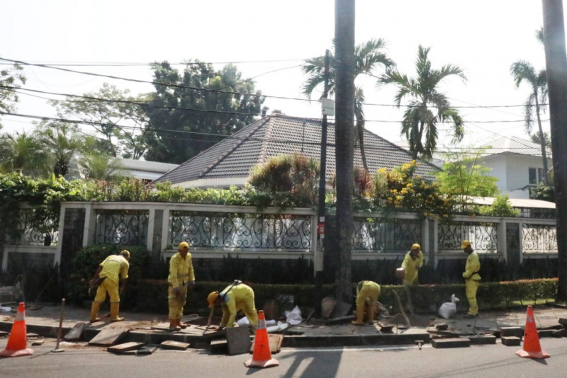 Petugas Suku Dinas (Sudin) Bina Marga Jakarta Pusat melakukan perbaikan trotoar yang sudah mulai rusak di Jalan Suwiryo, Menteng Jakarta Pusat, Jumat (14/7). Perbaikan ini dengan menata ulang paving block dan meninggikan kanstin yang sudah mulai rata dengan jalan.