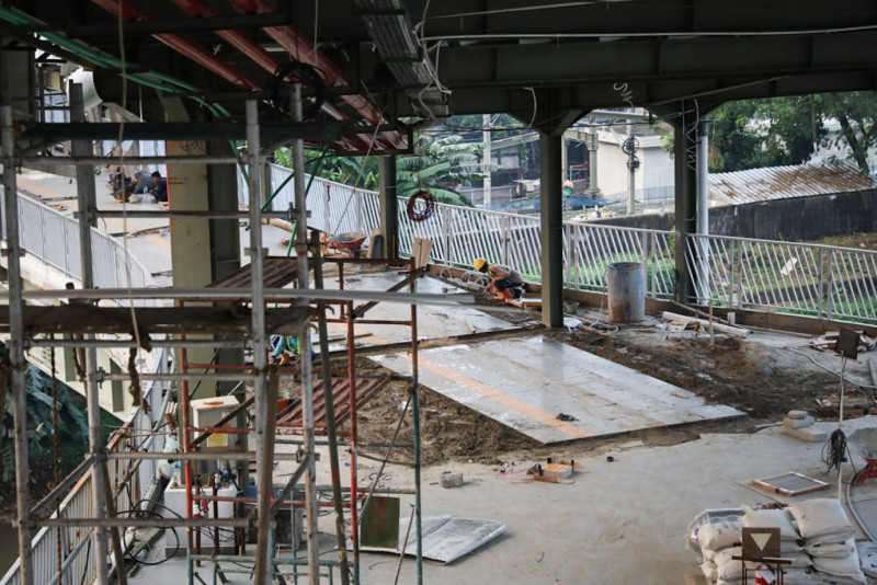 Sejumlah pekerja melakukan pengerjaan jembatan penyeberangan multiguna (JPM) Dukuh Atas di Jalan Galunggung, Setiabudi, Jakarta Selatan, Jumat (13/7).