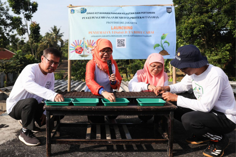Kepala Dinas Ketahanan Pangan, Kelautan dan Pertanian (KPKP) DKI Jakarta, Suharini Eliawati, memimpin launching Penyemaian Satu Juta Bibit Cabai di Kebun Bibit Cibubur, Kecamatan Ciracas, Jakarta Timur, Jumat (14/7). Kegiatan penyemaian satu juta bibit cabai ini dilakukan serempak secara hybrid di 14 kebon bibit binaan Dinas KPKP DKI Jakarta.