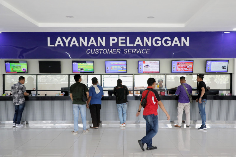Sejumlah calon penumpang membeli tiket di loket lantai dua Terminal Kampung Rambutan, Jakarta Timur, Sabtu (8/7). Sebelumnya, sebanyak 31 loket bus antar kota antar provinsi (AKAP) di Terminal Bus Kampung Rambutan sudah dipindahkan dari lantai dasar ke lantai dua terminal. Tiap loket dapat melayani 120 Perusahaan Otobus atau PO yang ada.