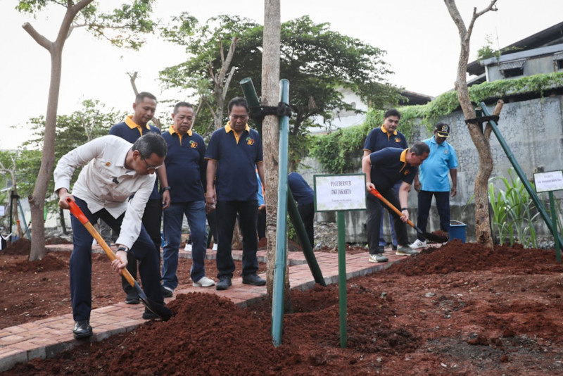 Penjabat (Pj) Gubernur DKI Jakarta, Heru Budi Hartono bersama Wali Kota Jakarta Utara, Ali Maulana Hakim melakukan penanaman pohon bersama di lokasi penataan kawasan Jalan Agung Perkasa 8, Sunter Agung, Tanjung Priok, Jakarta Utara, Jumat (7/7). Sebanyak 100 pohon tabebuya kuning ditanam di lokasi penataan kawasan seluas 3.263 meter persegi tersebut.