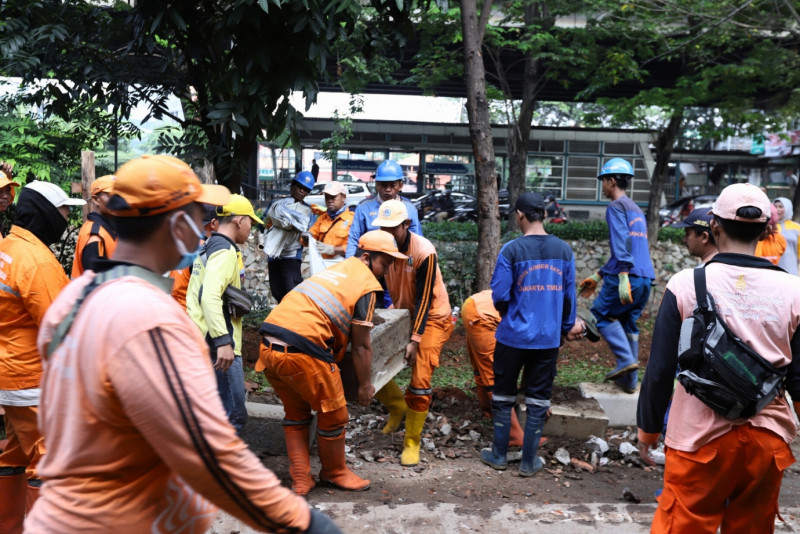 Wali Kota Jakarta Timur, Muhammad Anwar memimpin apel kerja bakti di Jalan Pulomas Selatan bantaran Kali IKIP, RW 07, Kayu Putih, Pulogadung, Jakarta Timur, Jumat (7/7). Sebanyak 300 personel dikerahkan dalam kerja bakti di lahan eks JT 21 ini untuk membersihkan puing sisa penertiban JT 21 dan pembangunan taman di lokasi tersebut serta pengerukan lumpur di Kali IKIP.