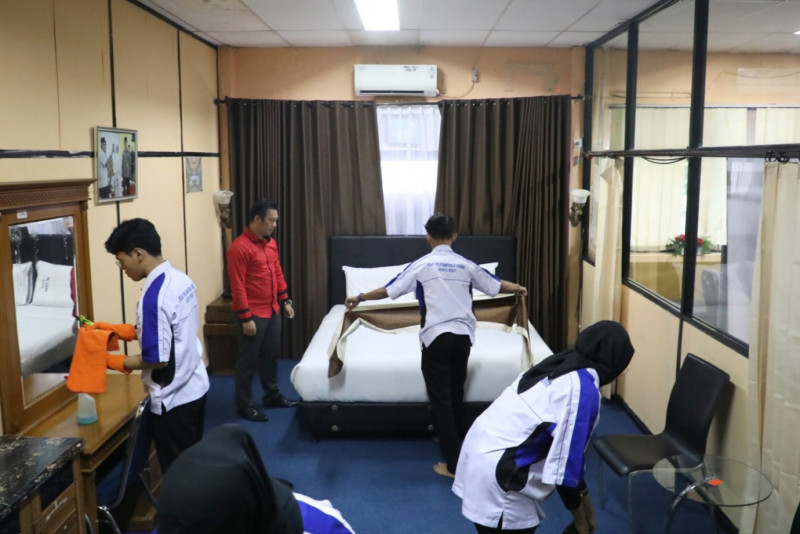 Sebanyak 19 peserta mengikuti pelatihan Tata Graha (Perhotelan) di Pusat Pelatihan Kerja Daerah (PPKD) Jakarta Pusat, Komplek Dinas Teknis Jati Baru, Gambir, Kamis (6/7). Pelatihan digelar selama 45 hari kerja mulai dari 15 Mei - 27 Juli 2023. Para peserta diberi materi pelatihan seperti menyiapkan kamar tamu, menata ruang dengan manual atau mesin.