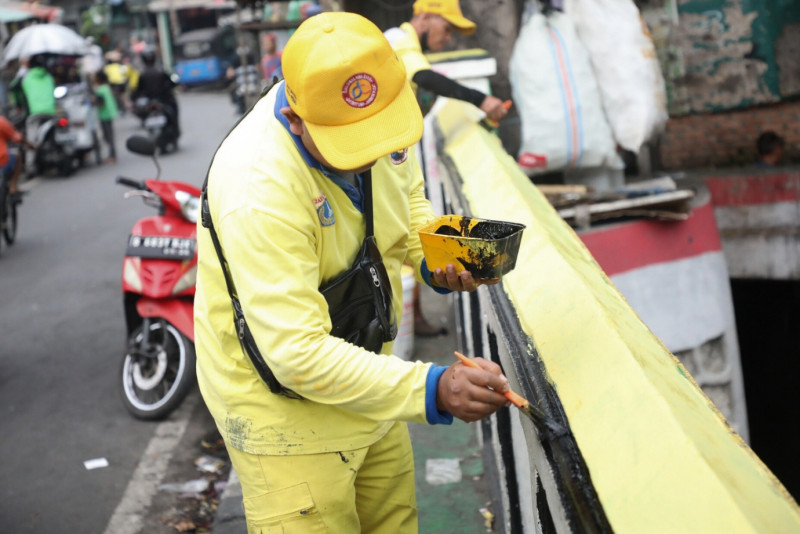 Suku Dinas Bina Marga Jakarta Pusat melakukan pengecatan jembatan penghubung antar kampung di Jalan Pulo Gundul, Tanah Tinggi, Jakarta Pusat, Jumat (7/7). Pengecatan dilakukan karena kondisi jembatan sudah kusam dan banyak vandalisme sehingga terlihat kumuh.