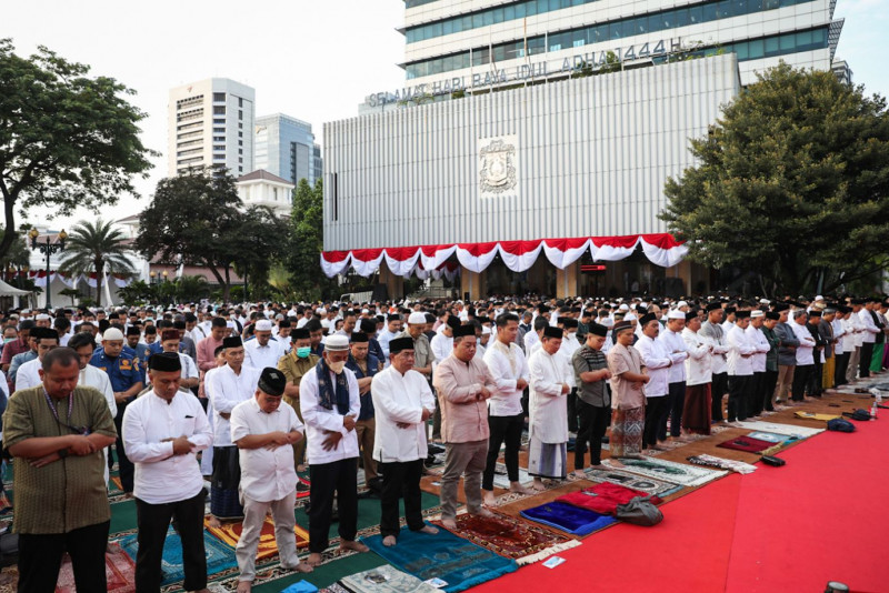 Pemerintah Provinsi (Pemprov) DKI Jakarta menggelar ibadah salat Iduladha 1444 H di halaman Balai Kota DKI Jakarta, Jalan Medan Merdeka Selatan, Gambir, Jakarta Pusat, Kamis (29/6). Turut hadir dalam salat berjemaah tersebut Penjabat (Pj) Gubernur Heru Budi Hartono, Sekretaris Daerah, Joko Agus Setyono dan sejumlah pejabat serta pegawai di lingkungan Pemprov DKI Jakarta.