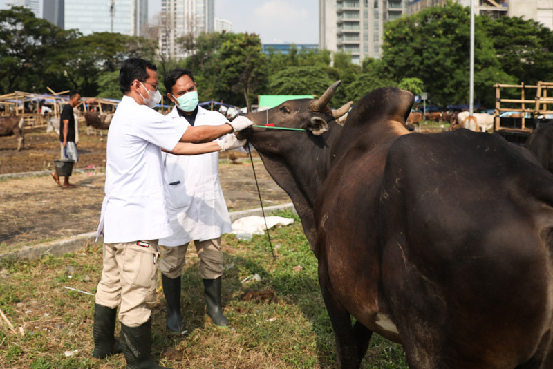 Dokter hewan dari Suku Dinas Ketahanan Pangan, Kelautan dan Pertanian (Sudin KPKP) Jakarta Selatan memeriksa kesehatan sapi kurban di tempat penampungan hewan kurban (TPnHK) kawasan Menteng Atas, Setiabudi, Jakarta Selatan, Jumat (23/6). Pemeriksaan tersebut untuk menjamin kesehatan hewan kurban yang dijual di Jakarta terbebas dari penyakit mulut dan kuku (PMK) dan lumpy skin disease (LSD).