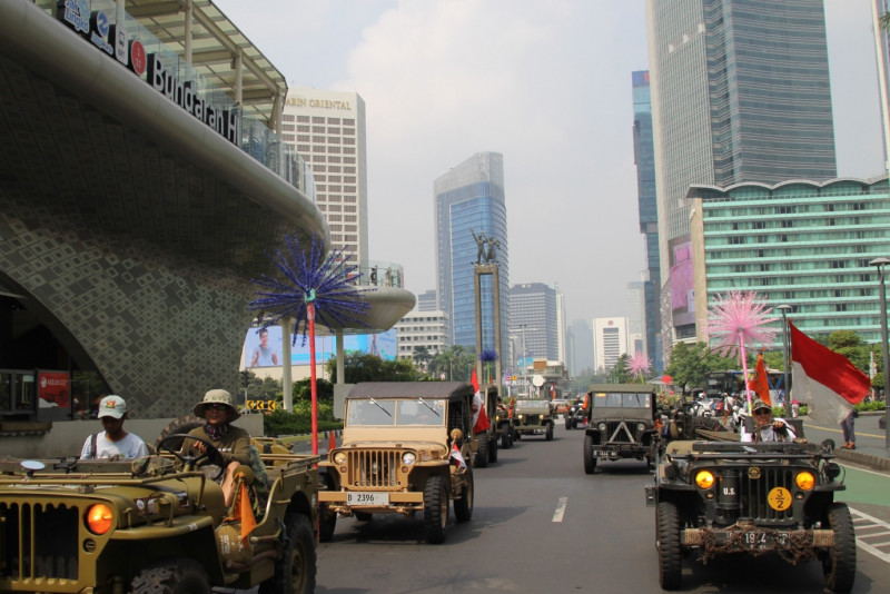 Komunitas Jakarta American Jeep (JAJ) menggelar Jakarta City Touring untuk memeriahkan HUY ke-496 Jakarta dengan rute Monas-Bundaran HI-Harmoni-Kota Tua-Monas, Sabtu (24/6). Kegiatan ini diikuti 200 peserta dan dilepas langsung oleh Kepala Dinas Kebudayaan DKI Jakarta, Iwan Henry Wardhana.