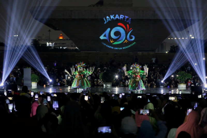 Pj Gubernur DKI Jakarta, Heru Budi Hartono menghadiri acara \"Gegap Gempita Monas\" di Silang Barat Kawasan Monumen Nasional (Monas), Jakarta Pusat, Sabtu (24/6). Dalam acara tersebut PJ Gubernur bersama jajaran Wali Kota, SKPD dan BUMD menyaksikan gelaran video mapping di bangunan Tugu Monas.