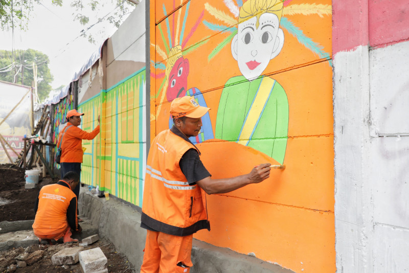 Sejumlah petugas Penanganan Prasarana dan Sarana Umum (PPSU) Jati Padang melakukan penataan kawasan unggulan di RT 05/04, Jalan TB Simatupang, Jati Padang, Pasar Minggu, Jakarta Selatan, Jumat (23/6). Lahan tidur berukuran sekitar 4x15 meter tersebut ditata menjadi taman dan dibuat mural dengan tema kebudayaan Betawi.