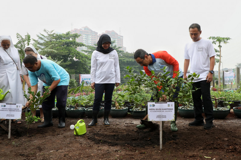 Penjabat (PJ) Gubernur DKI Jakarta, Heru Budi Hartono menghadiri Gerakan Jumat Menanam untuk Ketahanan Pangan di lahan Wisma Salesian Don Bosco, Sunter, Jakarta Utara, Jumat (16/6). Pemerintah Provinsi DKI Jakarta terus menggandeng berbagai pihak untuk menambah kawasan hijau di seluruh wilayah dalam upaya adaptasi perubahan iklim yang terjadi di Jakarta. Salah satunya dengan Wisma Salesian Don Bosco.
