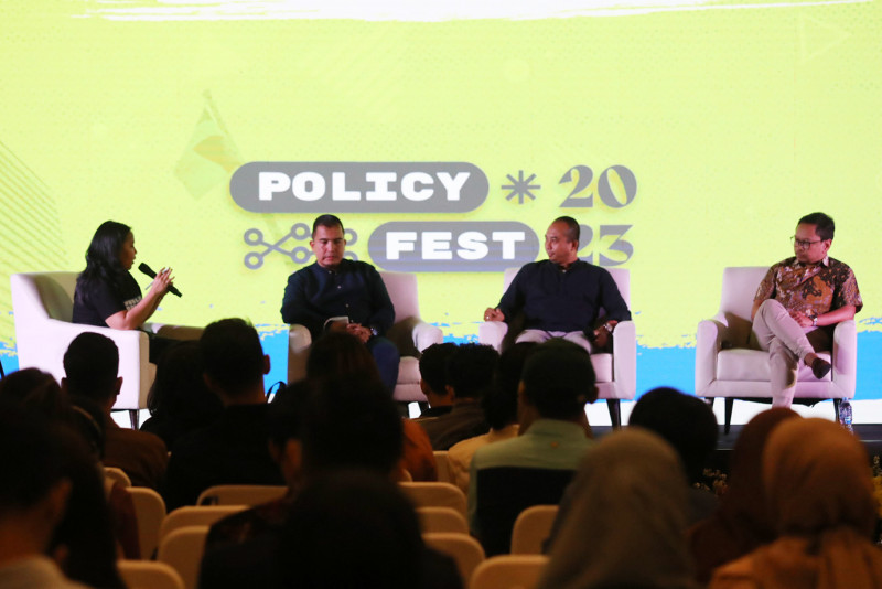 Puluhan generasi milenial mengikuti kegiatan Policy Fest 2023 yang diselenggarakan di Blok G, Balai Kota DKI Jakarta, Sabtu (17/6). Policy Fest hadir sebagai wadah untuk memfasilitasi publik agar lebih sadar, paham, dan terlibat dalam diskusi isu-isu terdepan kebijakan publik. Salah satunya talk show Ekonomi Digital bertajuk \"Kecerdasan Buatan dalam Kebijakan Publik: Menavigasi Kesempatan dan Tantangan\".