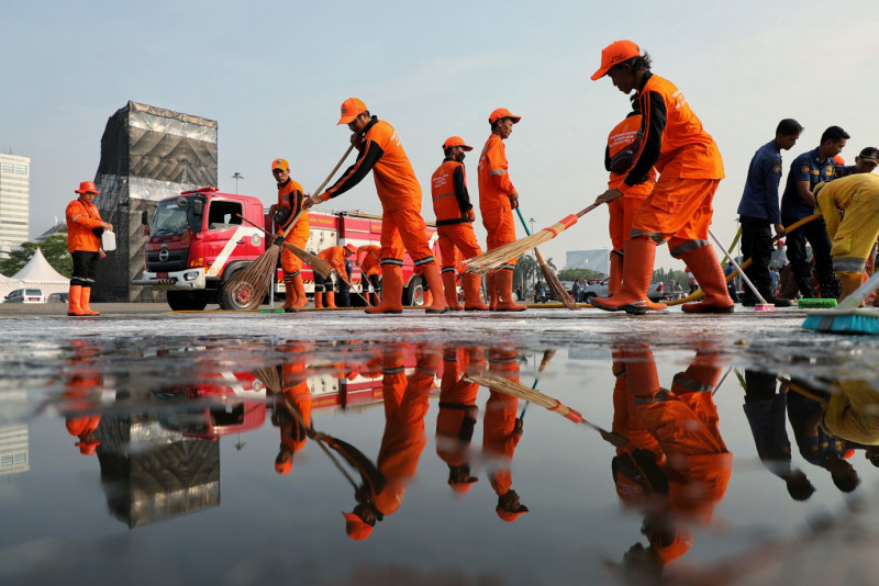 Dalam rangka persiapan peringatan Hari Lahir Pancasila pada 1 Juni 2023, Pemerintah Provinsi DKI Jakarta melakukan kerja bakti membersihkan kawasan Monumen Nasional (Monas), Jakarta Pusat, Sabtu (27/5). Kegiatan kerja bakti dipimpin Asisten Pemerintahan Sekretaris Daerah DKI Jakarta, Sigit Wijatmoko untuk mempersiapkan Monas sebagai lokasi Upacara Peringatan Hari Lahir Pancasila secara nasional.
