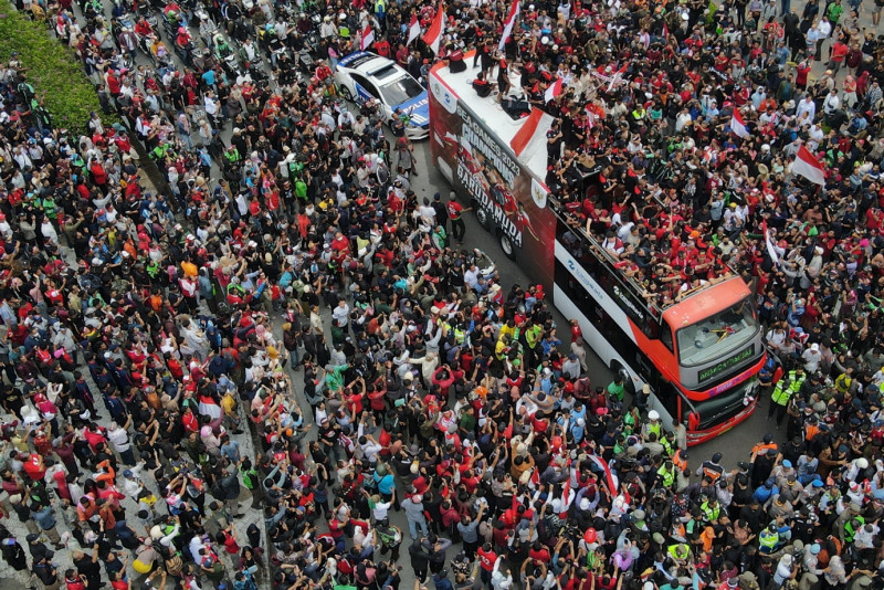 Ratusan kontingen atlet Indonesia Tim Nasional yang berlaga di ajang Sea Games 2023 mengikuti pawai kirab juara mulai dari Gedung Kemenpora RI, kawasan Bundaran Hotel Indonesia dan berakhir di Gelora Bung Karno (GBK), Jumat (19/5). Pawai kirab juara tersebut dilakukan usai para atlet berhasil membawa 87 medali emas, 80 perak, dan 109 perunggu pada perhelatan SEA Games 2023 di Kamboja.