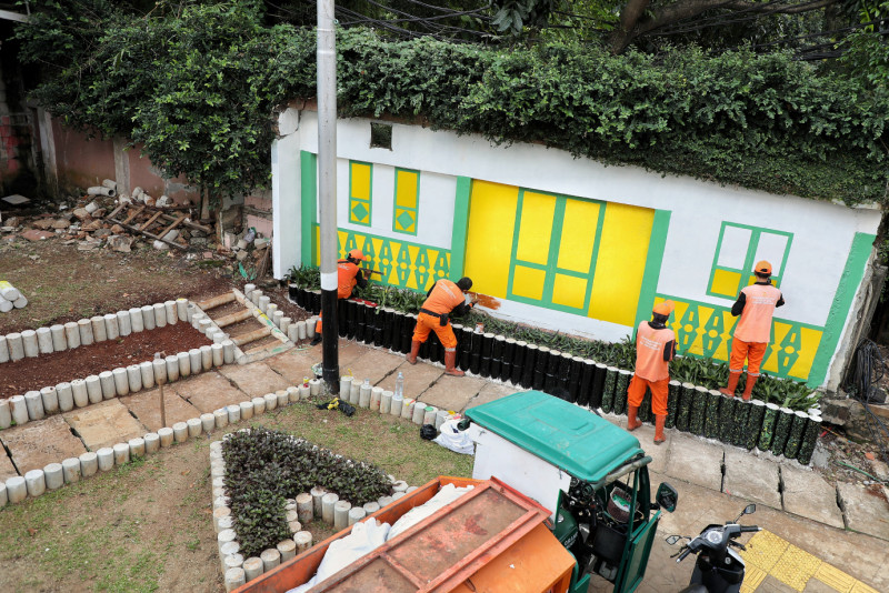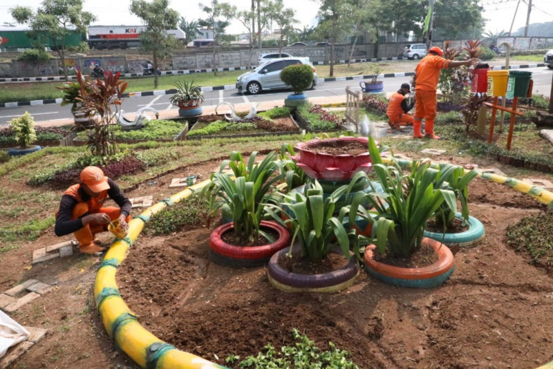 Petugas Penanganan Prasarana dan Sarana Umum (PPSU) Lenteng Agung melakukan penataan kawasan di Jalan Lenteng Agung Raya, Kelurahan Lenteng Agung, Kecamatan Jagakarsa, Jakarta Selatan, Jumat (19/5). Penataan kawasan tersebut dilakukan di lahan tidak terpakai milik Dinas Bina Marga DKI Jakarta sisa pembangunan Flyover Tapal Kuda Lenteng Agung dengan pembuatan taman serta spot selfie dengan tema rumah Betawi.