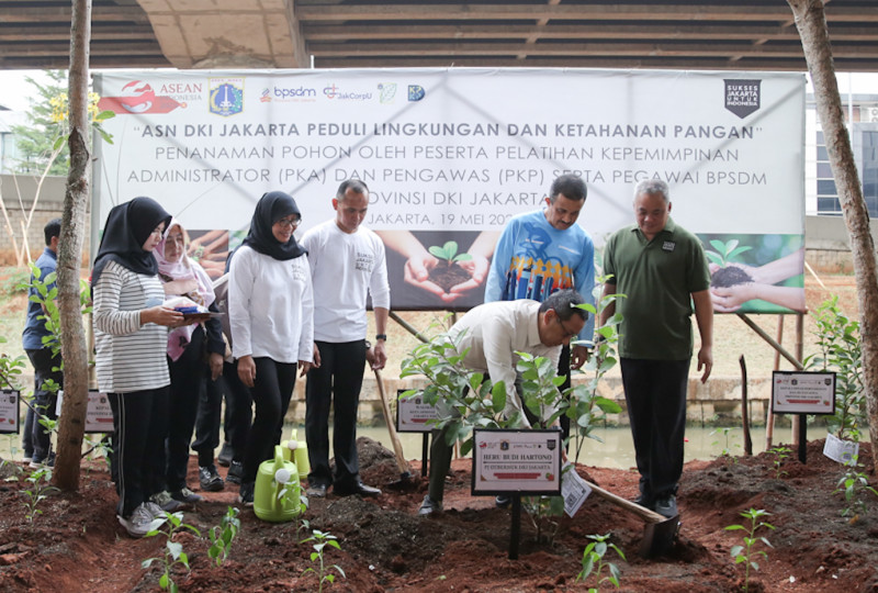 Penjabat (Pj) Gubernur DKI Jakarta, Heru Budi Hartono memimpin gerakan menanam bersama di area kolong Tol Becakayu, Jalan Laksamana Malahayati, Duren Sawit, Jakarta Timur, Jumat (19/6). Sebanyak 100 orang peserta Pelatihan Kepemimpinan Administrator (PKA) dan Pengawas (PKP) serta pegawai BPSDM Provinsi DKI Jakarta mengikuti kegiatan penanaman pohon bersama Pj Gubernur.