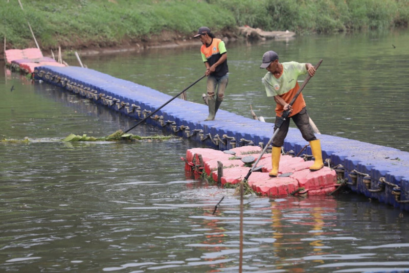 Petugas Unit Penanganan Sampah Badan Air (UPSBA) Dinas Lingkungan Hidup (LH) membersihkan sampah di sepanjang aliran Kanal Banjir Timur (KBT), Pondok Kopi, Duren Sawit, Jakarta Timur, Jumat (19/5). Setiap harinya tiga hingga lima kubik sampah berhasil diangkut petugas UPSBA.