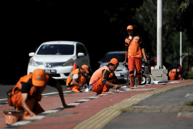 Petugas Penanganan Prasarana dan Sarana Umum (PPSU) Kelurahan Srengseng Sawah mengecat ulang kanstin di Jalan Lenteng Agung Raya, Jagakarsa, Jakarta Selatan, Jumat (12/5). Pengecatan kanstin dilakukan sebagai bentuk dukungan terhadap perhelatan Konferensi Tingkat Tinggi (KTT) ASEAN 2023 yang akan berlangsung dalam waktu dekat.