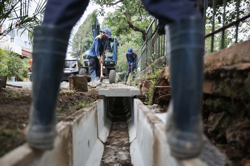 Petugas Suku Dinas Sumber Daya Air (Sudin SDA) Jakarta Barat melakukan perbaikan saluran air di Jalan Tanjung Duren Utara III, RT 06/02, Kecamatan Grogol Petamburan, Jakarta Barat, Jumat (12/5). Perbaikan saluran merupakan tindak lanjut usulan warga agar saluran yang sebelumnya tersumbat menjadi lancar kembali.