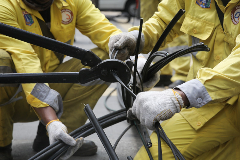 Petugas Dinas Bina Marga DKI Jakarta melakukan pemutusan dan relokasi jaringan kabel utilitas udara di Jalan Jenderal Sudirman, Kebayoran Baru, Jakarta Selatan, Selasa (9/5). Penertiban kabel udara tersebut untuk merapikan sisi Jalan Jenderal Sudirman dalam rangka menyambut KTT ASEAN 2023 yang akan terselenggara di Jakarta pada bulan September.