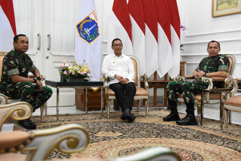 Pangdam Jaya, Mayjen Mohammad Hasan dan Danjen Kopassus, Mayjen Deddy Suryadi menemui Pj Gubernur di Balai Kota DKI Jakarta, Selasa (9/5). Kedatangan Pangdam Jaya dan Danjen Kopassus ini dalam rangka silaturahmi dengan Pj Gubernur.