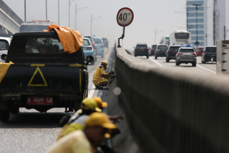 Satuan Pelaksana (Satpel) Bina Marga Kecamatan Pancoran mempercantik pembatas jalan flyover Pancoran, Jumat (5/5). Pengecatan pembatas jalan sepanjang 840 meter tersebut untuk meningkatkan visibilitas pengendara sehinga mengurangi risiko kecelakaan.
