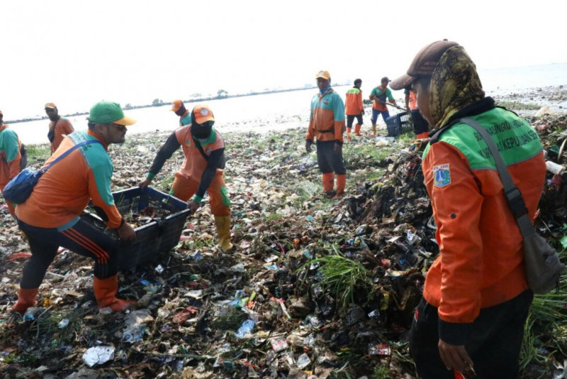 Dinas Lingkungan Hidup (LH) DKI Jakarta bergerak cepat mengerahkan 100 petugas gabungan untuk melakukan penanganan sampah di Muara Kanal Banjir Timur (KBT), Marunda Kepu, Cilincing, Jakarta Utara, Jumat (5/5). Petugas gabungan berasal dari UPS Badan Air Dinas Lingkungan Hidup DKI Jakarta, Sudin Lingkungan Hidup Kepulauan Seribu dan Sudin Lingkungan Hidup Jakarta Utara. Sebanyak 50 meter kubik sampah di lokasi tersebut sudah diangkut hingga saat ini.
