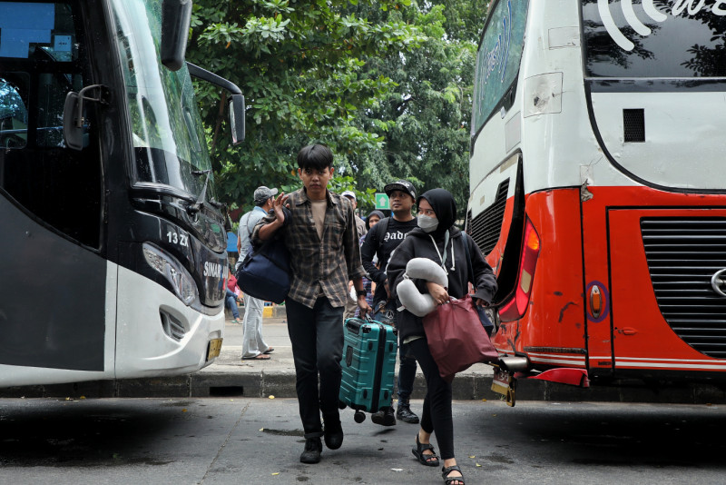 Sejumlah pemudik tiba di Terminal Kampung Rambutan, Ciracas, Jakarta Timur, Rabu (26/4). Arus balik #Idulfitri 1444 Hijriah di Terminal Kampung Rambutan meningkat tercatat 20.400 penumpang tiba di Jakarta.