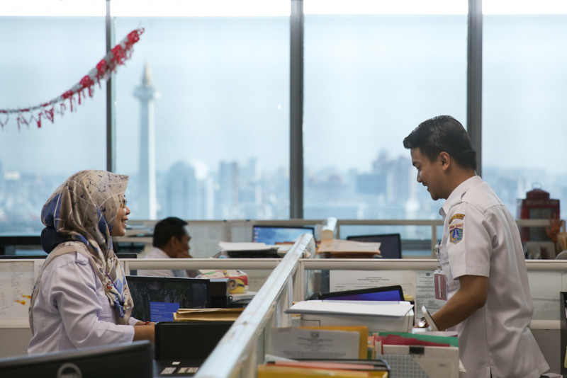 Sejumlah aparatur sipil negara Pemerintah Provinsi (ASN Pemprov) DKI Jakarta kembali bekerja di Balai Kota DKI Jakarta, Gambir, Jakarta Pusat, Rabu (26/4). ASN Pemprov DKI Jakarta dijadwalkan masuk pukul 08.00 setelah cuti bersama pada 19 - 25 April 2023.