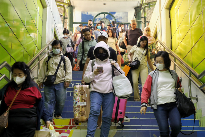 Sebanyak 15.900 penumpang pengguna kereta api arus balik lebaran 2023 tiba di Stasiun Gambir, Kecamatan Gambir, Jakarta Pusat, Kamis (27/4). 15.900 merupakan bagian dari total 43.500 pengguna kereta api yang kembali ke Jakarta