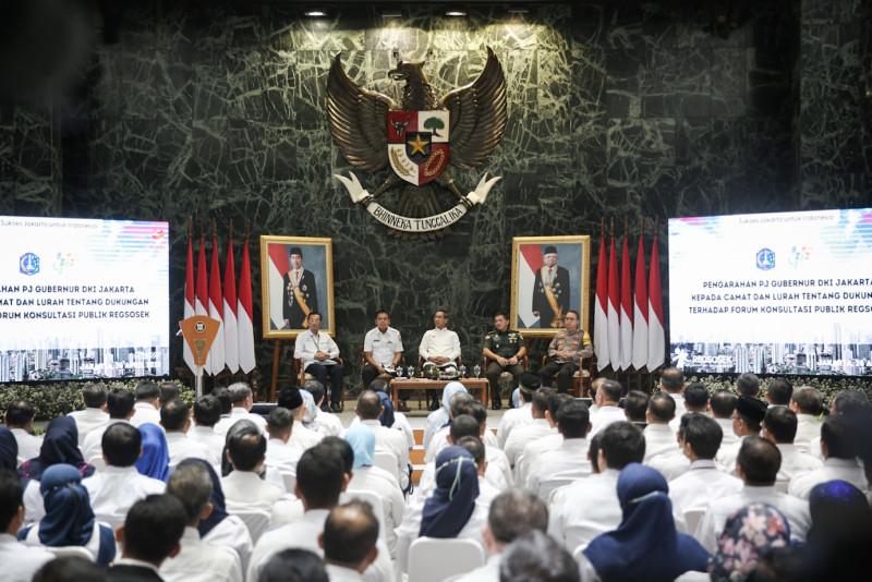 Penjabat (Pj) Gubernur DKI Jakarta, Heru Budi Hartono memberikan pengarahan kepada Camat dan Lurah se-DKI Jakarta di Balai Agung, Balai Kota DKI Jakarta, Rabu (26/4). Dalam pengarahan tersebut, Pj Gubernur meminta dukungan Camat dan Lurah terhadap Forum Konsultasi Publik Registrasi Sosial Ekonomi (Regsosek).