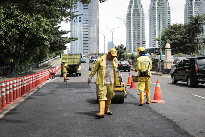 Petugas Suku Dinas (Sudin) Bina Marga Jakarta Pusat melakukan penambalan aspal jalan yang berlubang di Jalan HOS Cokroaminoto, Menteng, Jakarta Pusat, Jumat (14/4). Pengaspalan tersebut dilakukan agar tidak membahayakan dan menambah nyaman pengguna jalan.