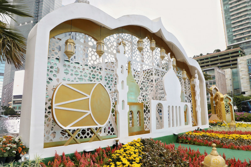 Dinas Pertamanan dan Hutan Kota mempercantik kawasan Bundaran Hotel Indonesia (HI) Kecamatan Menteng, Jakarta Pusat, Jumat (14/4). Dekorasi berbentuk masjid tersebut untuk menyambut Hari Raya Idulfitri 1444 Hijriah.