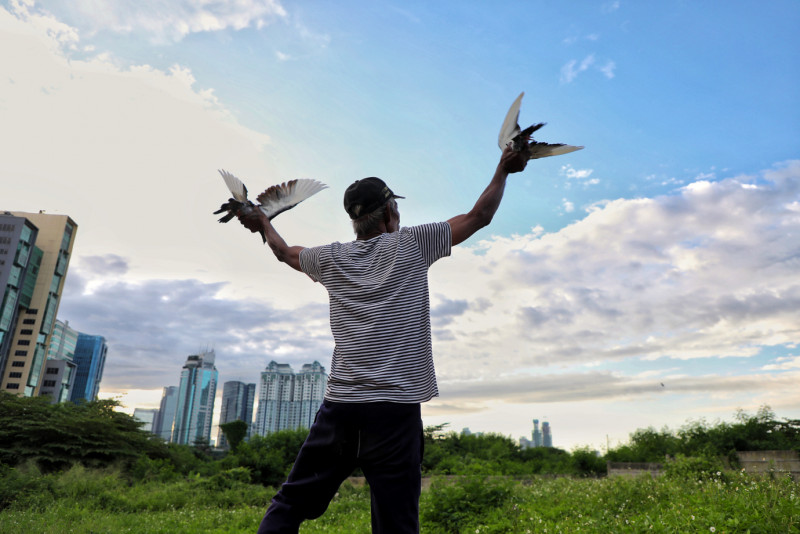 Melihat aktivitas warga yang sedang melatih burung dara di kawasan Setia Budi, Jakarta Selatan, Kamis (13/4). Kegiatan tersebut dilakukan pada sore hari sambil menunggu waktu berbuka puasa atau ngabuburit di bulan #Ramadan. Burung yang dilatih nantinya akan diikutkan dalam perlombaan.