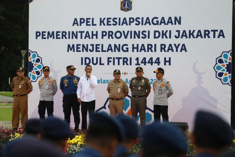 Penjabat (Pj) Gubernur DKI Jakarta, Heru Budi Hartono memimpin Apel Kesiapsiagaan Pemprov DKI Menjelang Hari Raya Idulfitri 1444 Hijriah di bulan #Ramadan, di Silang Selatan Monumen Nasional (Monas), Jakarta Pusat, Selasa (11/4). Dalam Apel ini turut mendampingi Asisten Pemerintahan Setda DKI Jakarta Sigit Wijatmoko, Kasatpol PP DKI Jakarta Arifin, Kadishub Syafrin Liputo, serta Kadis Gulkarmat Satriadi Gunawan.