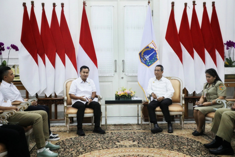 Penjabat Gubernur DKI Jakarta, Heru Budi Hartono menerima kunjungan Himpunan Pengusaha Muda Indonesia (HIPMI) Jaya di Ruang Tamu Gubernur, Balai Kota DKI Jakarta, Selasa (11/04). Pertemuan ini bertujuan untuk penyelarasan program bidang perekonomian dan bidang lain yang sedang digulirkan oleh HIPMI dengan Pemprov DKI Jakarta.