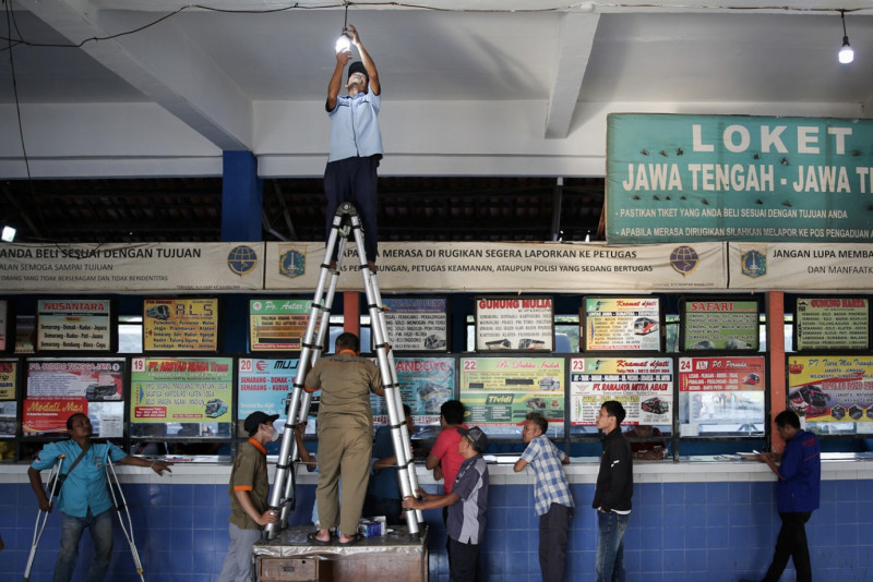 Sejumlah pekerja memperbaiki sejumlah fasilitas dan bangunan Terminal Kampung Rambutan, Kecamatan Ciracas, Jakarta Timur, Senin (10/4). Perbaikan yang di antaranya meliputi pengecatan dinding, penambahan lampu dan perbaikan tangga untuk memberikan kenyamanan penumpang yang akan mudik ke kampung halaman.