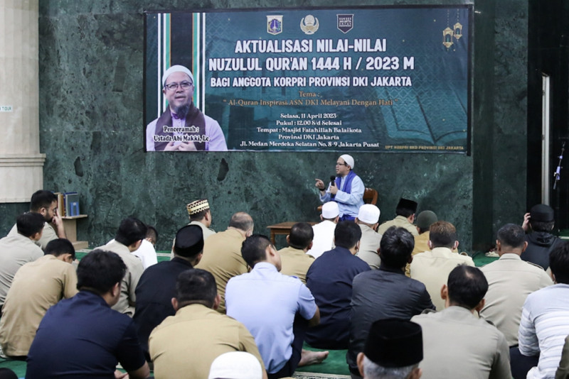 Korps Pegawai Republik Indonesia (KORPRI) DKI Jakarta pada #Ramadan tahun ini menggelar kajian aktualisasi nilai-nilai Nuzulul Quran 1444 H dengan tema Al-Quran Inspirasi ASN DKI Melayani dengan Hati di Masjid Fatahillah Balai Kota DKI Jakarta, Selasa (11/4). Kajian dibuka Kepala Biro Pendidikan dan Mental Spiritual (Dikmental) Setda Provinsi DKI Jakarta, Gunas Mahdianto dan menjadi penceramah, Ustaz Abi Makki.