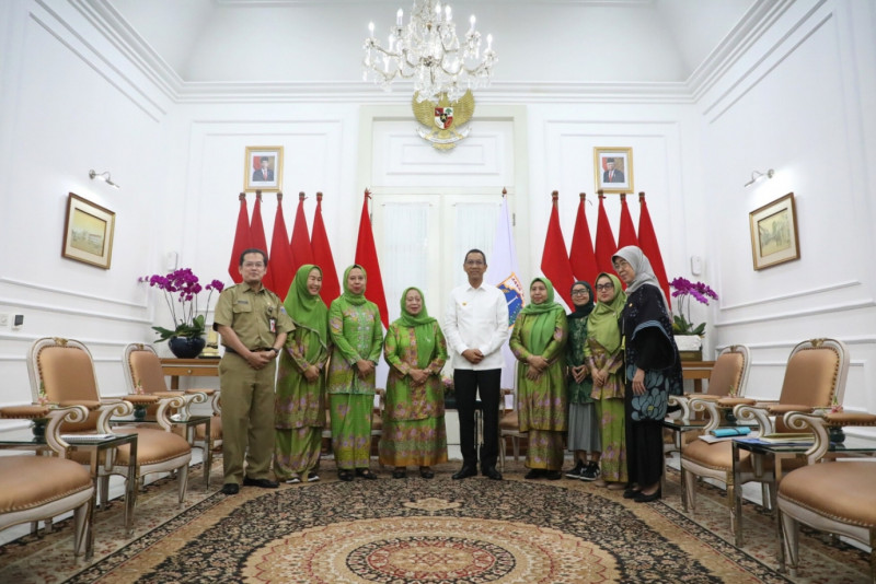 Penjabat (Pj) Gubernur DKI Jakarta, Heru Budi Hartono menerima kunjungan dari Pimpinan Wilayah Muslimat Nahdlatul Ulama (NU) di Balai Kota DKI Jakarta, Senin (10/4). Pertemuan ini dalam rangka silaturahmi sekaligus bersinergi program antara di PW Muslimat NU dan Pemprov DKI Jakarta.