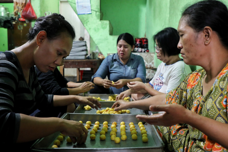 Pekerja menyelesaikan pembuatan kue kering pada sentra Usaha Mikro Kecil dan Menengah (UMKM) Pusaka Kwitang di Jalan Inspeksi Kali Ciliwung, Kwitang, Jakarta Pusat, Senin (10/4). Pada #Ramadan tahun ini pelaku usaha menyatakan menjelang lebaran Idul Fitri 2023, kue kering yang dijual dengan harga Rp80 ribu per kilogramnya tersebut mengalami peningkatan sekitar 30 persen jika dibandingkan tahun lalu.