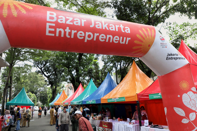 Sebanyak 30 Jakpreneur meramaikan Bazar #Ramadan yang digagas Suku Dinas Perindustrian Perdagangan Koperasi Usaha Kecil dan Menengah (PPKUKM) Jakarta Selatan di halaman Kantor Kecamatan Kebayoran Baru, Jakarta Selatan, Rabu (5/4). Bazar Ramadan ini merupakan upaya pemerintah membantu menggerakan roda perekonomian warga.