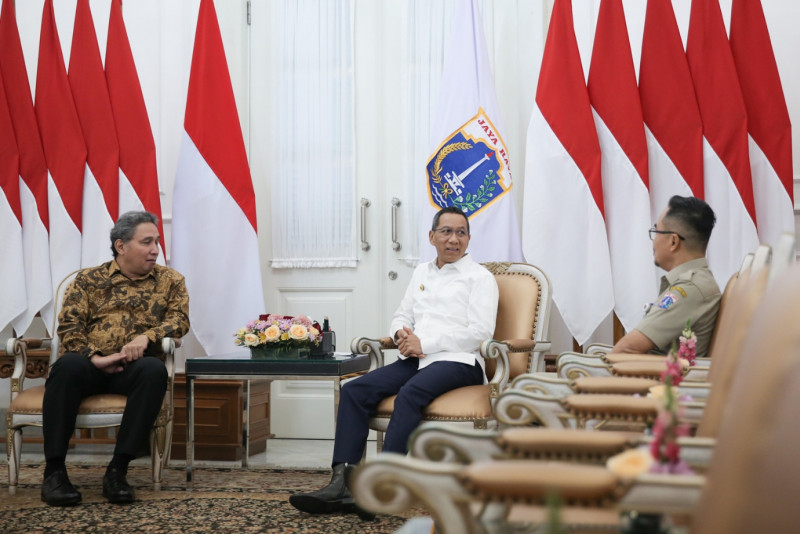 Penjabat (Pj) Gubernur DKI Jakarta, Heru Budi Hartono menerima kunjungan Direktur Jenderal Kementerian Pendidikan, Kebudayaan, Riset, dan Teknologi (Dirjen Kemendikbudristek) RI, Hilmar Farid di Ruang Tamu Utama Balai Kota DKI Jakarta, Gambir, Jakarta Pusat, Selasa (4/4). Pertemuan ini membahas Tata Kelola Manajemen Taman Ismail Marzuki (TIM) dan program kalender event.