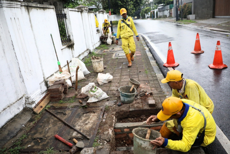 Enam petugas Satuan Pelaksana (Satpel) Bina Marga Kecamatan Menteng melakukan perbaikan tali air di Jalan Syamsu Rizal, Menteng, Jakarta Pusat, Senin (3/4). Perbaikan ini dilakukan karena tali air sudah rusak karena endapan lumpur sehingga saluran tidak bekerja secara normal.