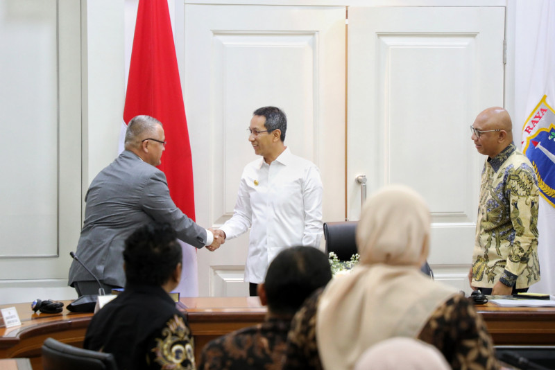 Penjabat (Pj) Gubernur Provinsi DKI Jakarta, Heru Budi Hartono menerima kunjungan Presiden Intelligent Transport System (ITS) Indonesia, William Sabandar bersama CEO uScovery DMCC Dubai, Oleg Zaretskiy di Balai Kota DKI Jakarta, Rabu (29/3). Kunjungan ini dalam rangka audiensi terkait penggunaan teknologi transportasi cerdas yang lebih mutakhir dalam menangani berbagai persoalan transportasi seperti kemacetan di perkotaan dan peningkatan mobilitas di kawasan sub perkotaan.