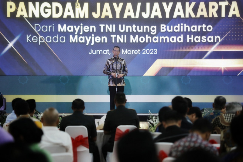 Penjabat (Pj) Gubernur DKI Jakarta, Heru Budi Hartono menghadiri acara lepas sambut Pangdam Jaya/Jayakarta dari Mayjen TNI Untung Budiarto kepada Mayjend TNI Mohamad Hasan di Aula Sudirman Makodam Jaya, Jalan Mayjend Sutoyo, Cawang, Kramat Jati, Jakarta Timur, Jumat (24/03). Pj Gubernur mengucapkan terima kasih kepada Mayjen TNI Untung Budiharto yang telah bersinergi dan berkomunikasi dalam membangun warga Jakarta dan mengucapkan selamat kepada Mayjen TNI Mohamad Hasan atas tugas dan amanah sebagai Panglima Kodam Jaya. (Foto: Mochamad Tresna Suheryanto/beritajakarta.id)