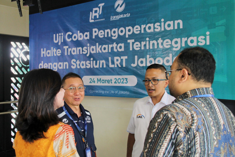 PT Transportasi Jakarta (Transjakarta) dan LRT Jabodebek menandatangani Berita Acara Operasional Prasarana Halte BRT Terintegrasi Stasiun Kereta Api nRingan/Light Rail Transit (LRT) Wilayah Jakarta, Bogor, Depok dan Bekasi di Halte Transjakarta GOR Sumantri, Kuningan, Jakarta Selatan, Jumat (24/3). Penandatanganan ini merupakan upaya untuk meningkatkan pelayanan kepada pelanggan Transjakarta dikarenakan terdapat 9 Halte BRT Transjakarta yang akan dioperasikan setelah terdampak pembangunan proyek LRT Jabodebek. (Foto: Andri Widiyanto/beritajakarta.id)